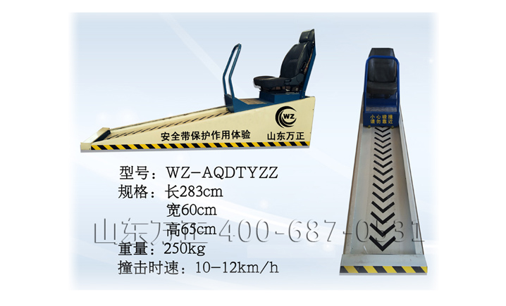 安全带碰撞体验装置设备是由山东万正自主研发、用于道路交通安全教育的技术装备。利用该装置可以模拟低速运行车辆发生意外碰撞,在确保体验人员人身安全的前提下,让体验者感受车辆发生碰撞时的自身感受及系好安全带的必要性,增强体验人员安全驾驶意识。